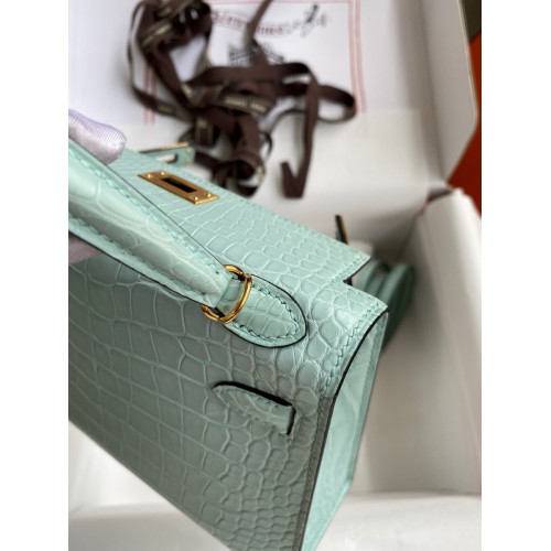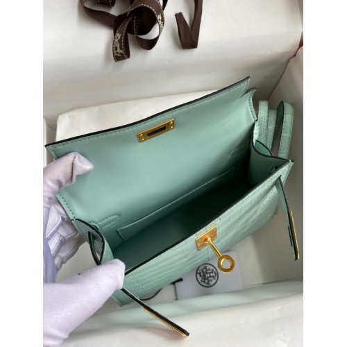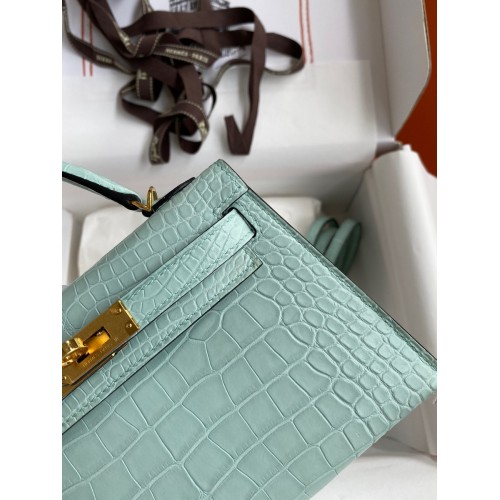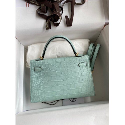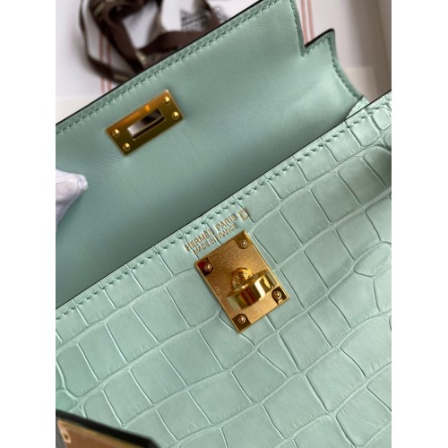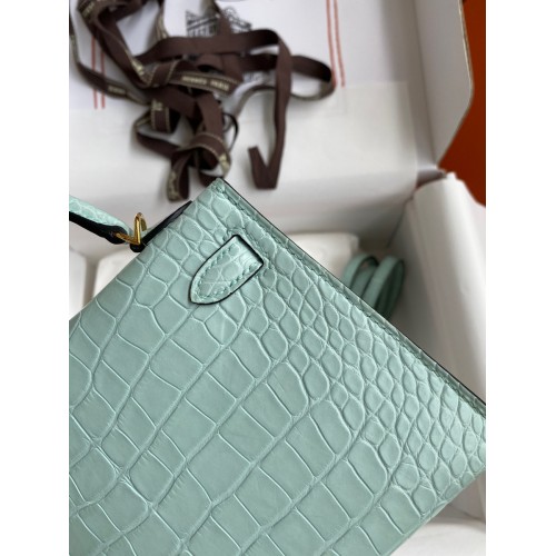 Hermes Kelly Mini II Sellier Handmade Bag In Vert D'eau Matte Alligator Leather