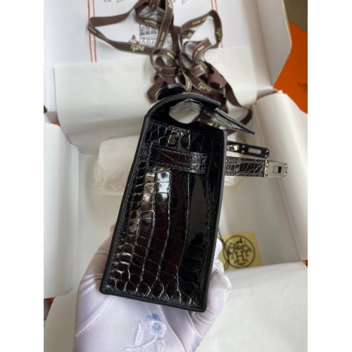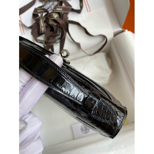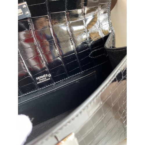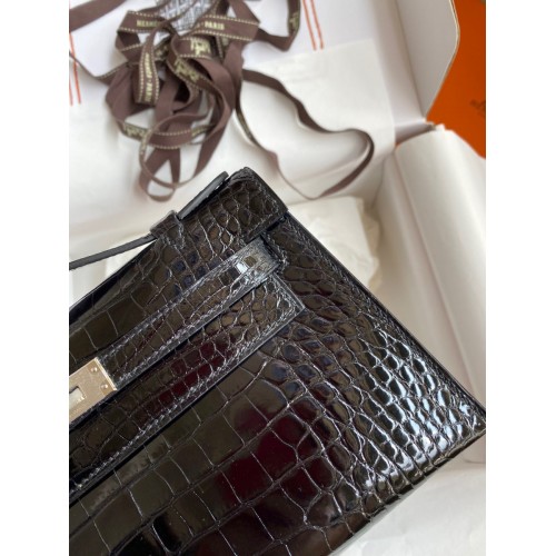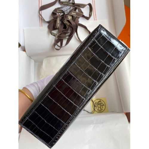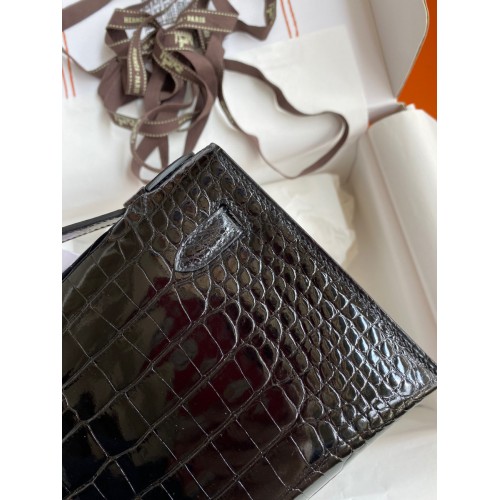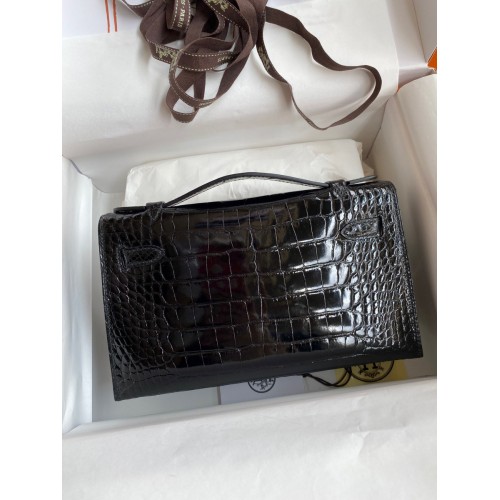 Hermes Kelly Pochette Handmade Bag In Black Shiny Alligator Leather