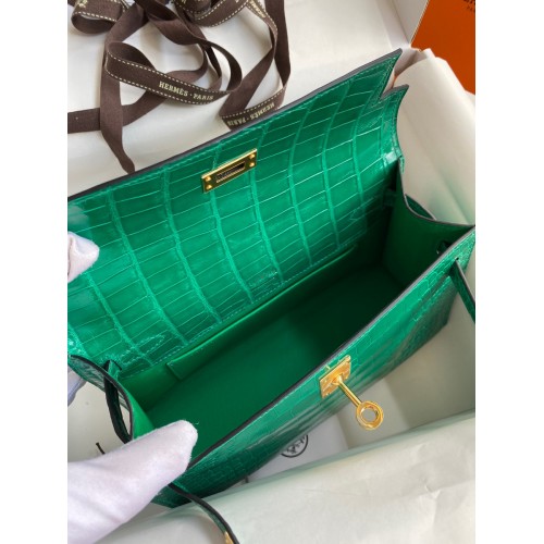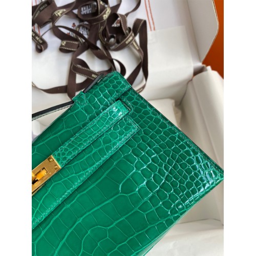 Hermes Kelly Pochette Handmade Bag In Vert Emerald Shiny Alligator Leather