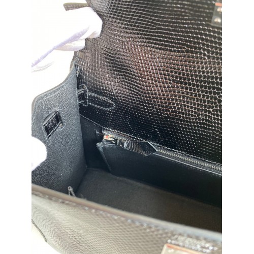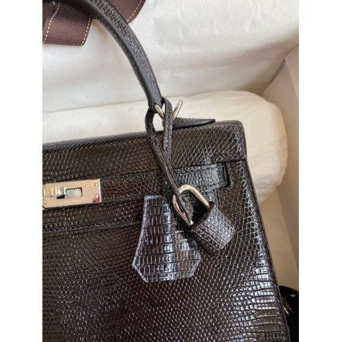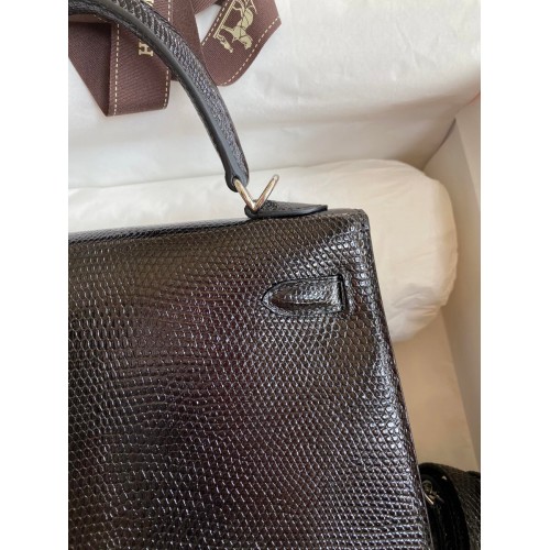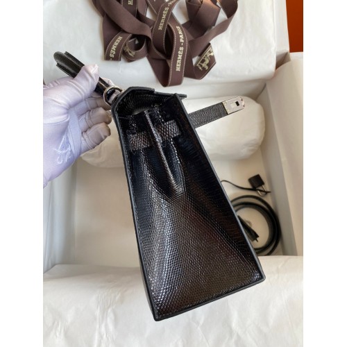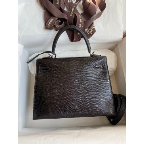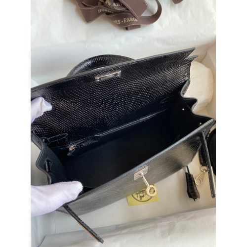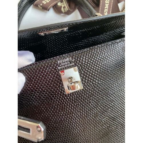 Hermes Kelly Sellier 25 Handmade Bag In Black Lizard Leather