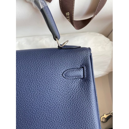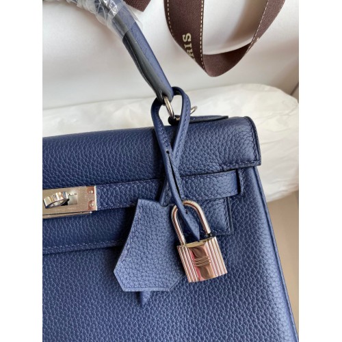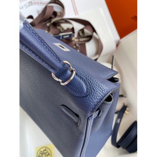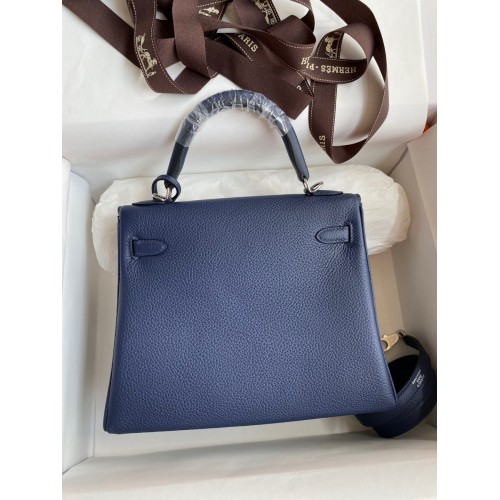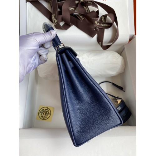 Hermes Kelly Retourne 25 Handmade Bag In Blue Saphir Clemence Leather
