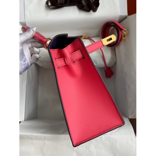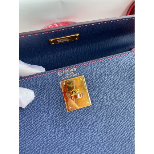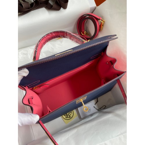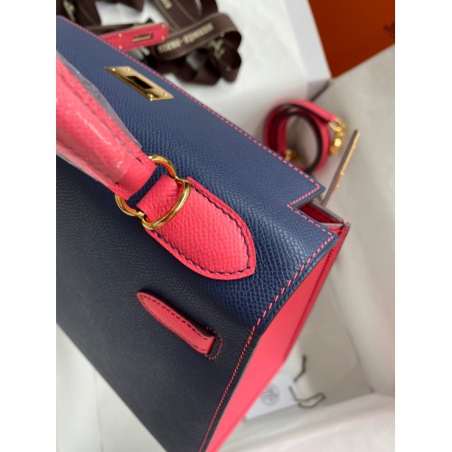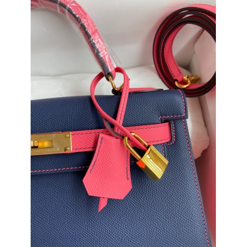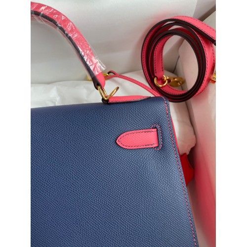 Hermes Kelly Sellier 28 Bicolor Bag in Blue Saphir and Rose Lipstick Epsom Calfskin