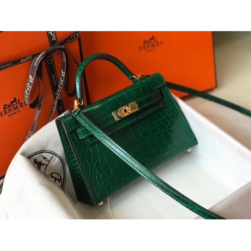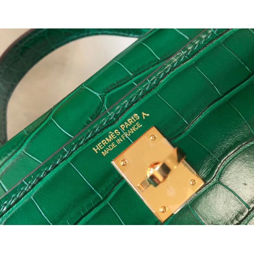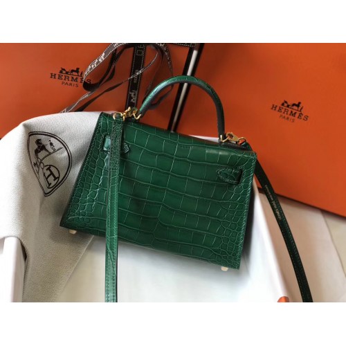 Hermes Kelly Mini II Handmade Bag In Green Crocodile Embossed Leather