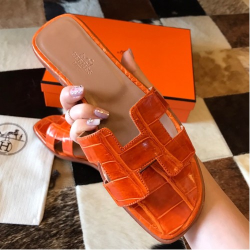 Hermes Oran Slide Sandals In Orange Shiny Niloticus Crocodile Skin